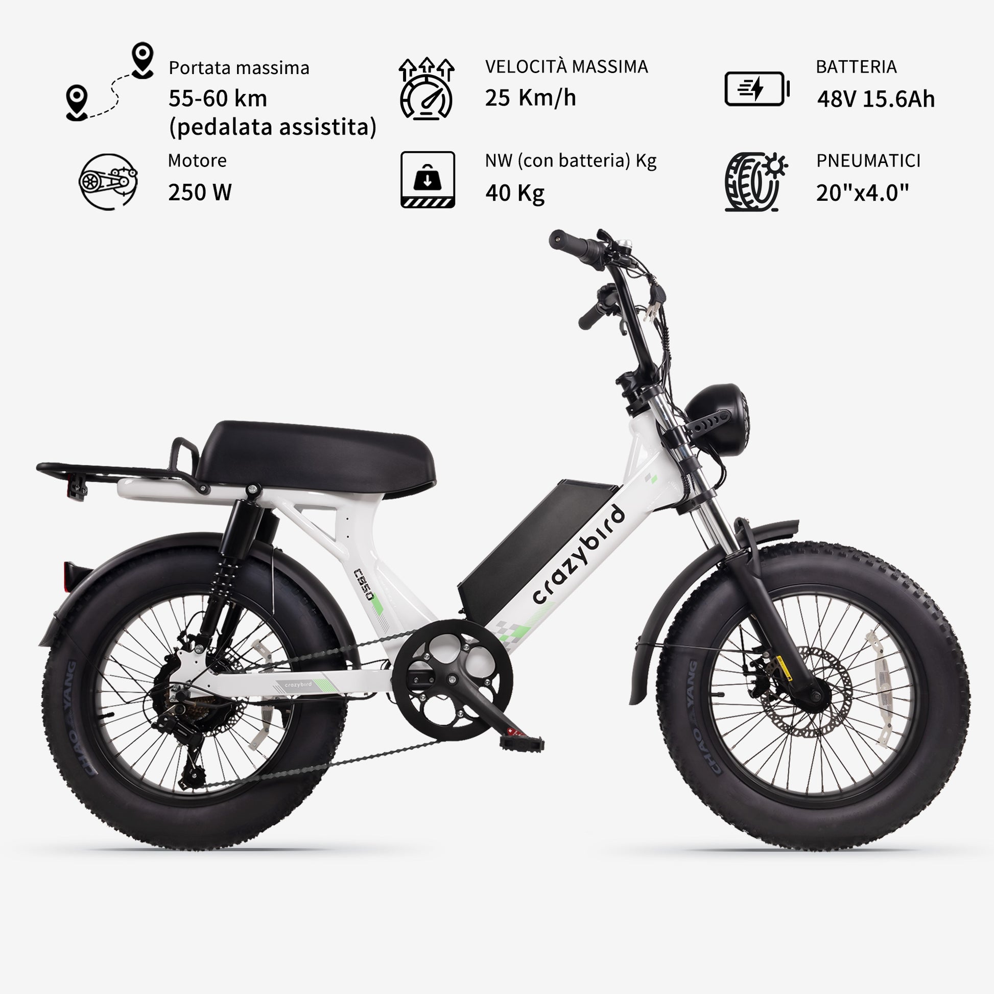 - Batteria da 48 V 10,4 Ah, motore da 250 W.